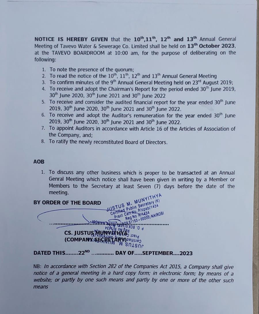 TAVEVO Water and Sewerage Company Ltd > Media Center > News > NOTICE OF THE ANNUAL GENERAL MEETING OF TAVEVO WATER AND SEWERAGE COMPANY LIMITED. > AGM2